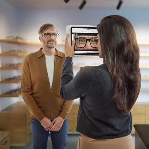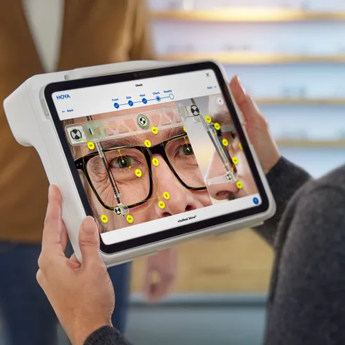 Le visuReal MoveAI est convivial et a été mis au point pour rendre accessibles et compréhensibles à tous les utilisateurs les technologies innovantes de HOYA. L’application intuitive tourne sur un iPad connecté à des équipements optiques et, conjointement avec l’étrier de mesure tout en un, le système garantit des mesures précises et exactes. Dans votre magasin, l’utilisation de visuReal MoveAI jouera un rôle décisif auprès de votre clientèle dans l’expérience d’achat, en leur faisant profiter d’un centrage rapide et optimisé.