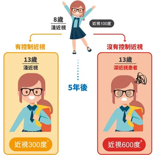 小孩眼睛正處於成長階段,近視一旦出現,只會隨著眼球增長而不斷增加,而且近視出現的年齡愈早,小孩未來患有深近視的機會愈大!因此,愈早進行近視管理,減慢近視加深速度的成效便會愈為明顯。